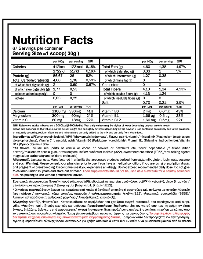 -85% απομονωμένη πρωτεΐνη ορού γάλακτος (WPI 95%), ένας καθαρός τύπος πρωτεΐνης που υποβάλλεται σε πολλαπλά επίπεδα φιλτραρίσματος για την απομάκρυνση μη πρωτεϊνικών συστατικών όπως το λίπος, η χοληστερόλη και η λακτόζη, με αποτέλεσμα ένα 95% πραγματικό πρωτεϊνικό συστατικό.